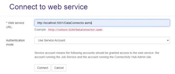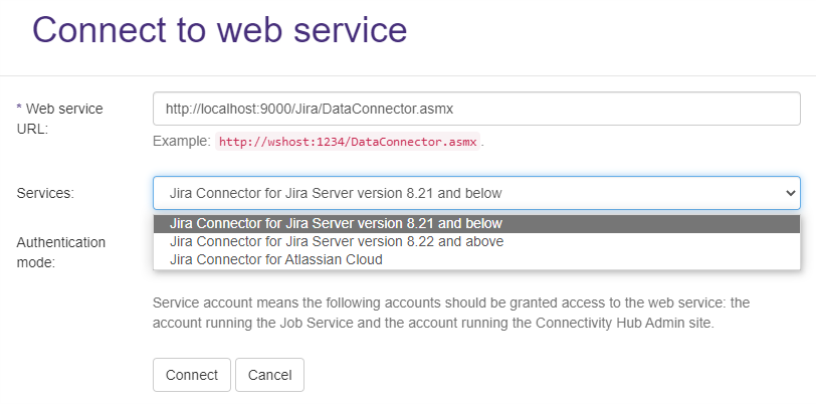 - Use the URL to your Jira connector as specified in IIS, with "DataConnector.asmx" appended as shown in the example.