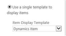 - Go to the Search Results web part > Settings. Under Display Templates, choose Use a single template to display items, and select Dynamics Item from the list.