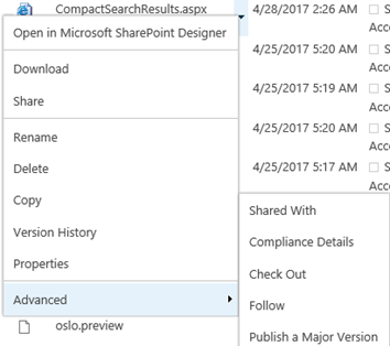 and select Site contents > Master pages and page layouts. Find CompactSearchResults.aspx, click on the page and from the drop-down under Advanced, selectPublish a major version.