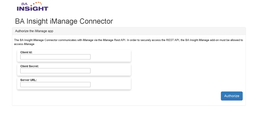 - The iManage connector is pre-configured to work with the US Region and comes with the BA Insight application ID for the OAuth authorization process.