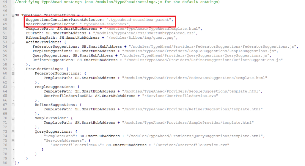 8. Locate the section SH.TypeAhead.CustomSettings  and edit SuggestionsContainerParentSelector and  SearchBoxInputSelector properties to match your selectors.