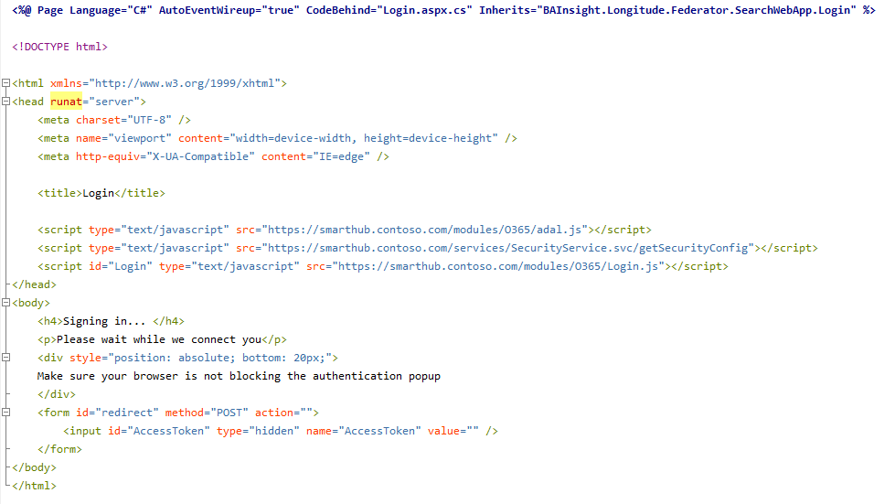 10. Edit your copy of Login.aspx page and replace  https://smarthub.contoso.com/  with your SmartHub address.