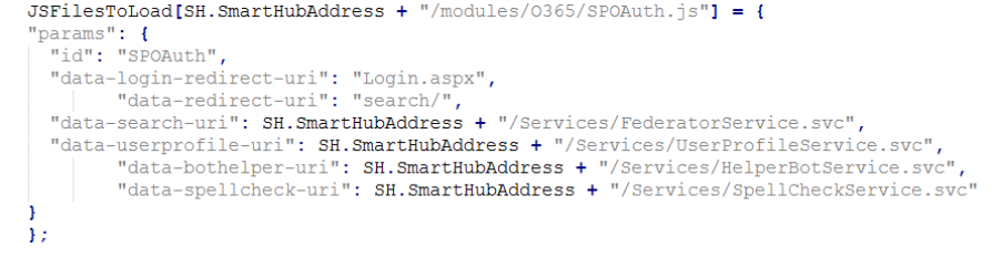 2. In the section SH.Loader.JSFilesToLoad , locate  https://smarthub.contoso.com /modules/O365/SPOAuth.js and change the property data-login-redirect-uri to match the full path where you uploaded your custom Login.aspx file.