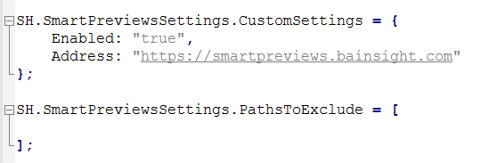 - Paste the copied settings inside the section SH.SmartPreviews.CustomSettings and change them accordingly:
