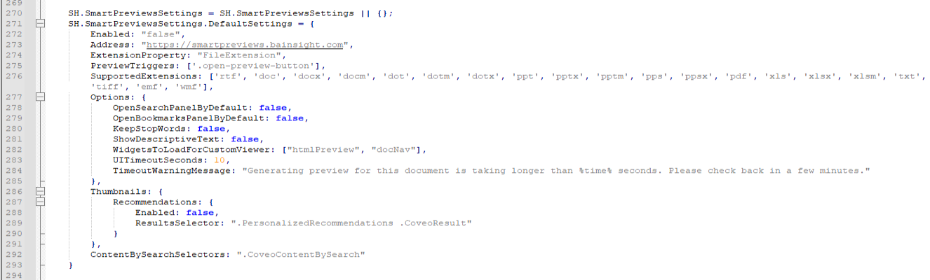 - Open the file DefaultModuleSettings.js, which contains all SmartHub Smart Previews settings around line 270. See below.