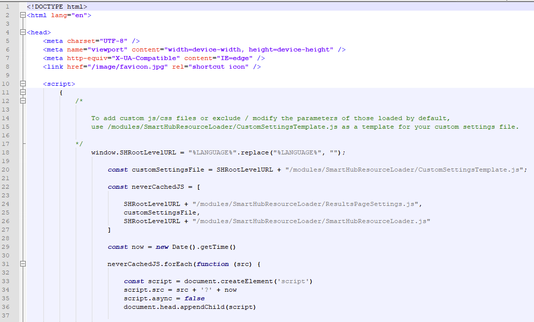 - On the page "Index.html" SmartHubResourceLoader uses the settings file "IndexPageSettings.js" to load the settings on the Index (start or home) page.