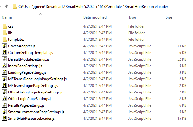 The files described in the table below contain the code responsible for your SmartHub Index (or landing page), and Results pages.