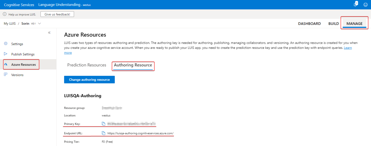 2. The Authoring Key and Endpoint are shown in the screenshot below.