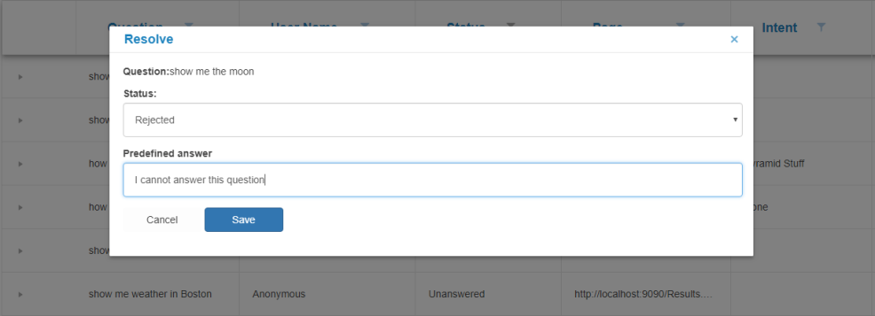 Available resolutions include:- Unanswered:Response is fixed: "We are sorry. We don't have an answer for you."