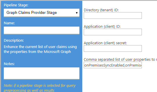 - Add and configure a Graph Claims Provider stage and provide the directory ID, client ID, and client secret from the previous steps along with the list of user properties to be fetched from Microsoft Graph: