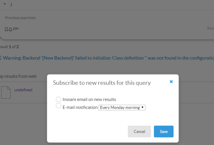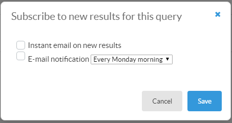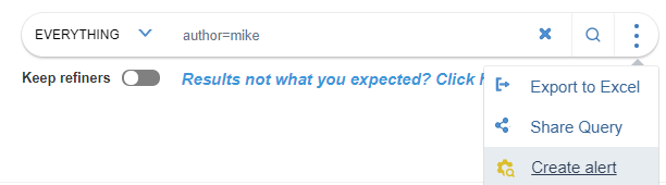 - Select "Create alert" from the dot icon menu directly attached to the search query field, and follow the instructions that appear.