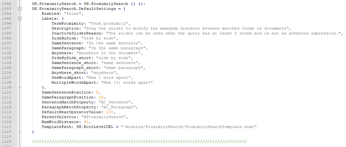 - Copy the Proximity Search settings (from 1093 to 1118 in the code example above) into your custom settings file and set