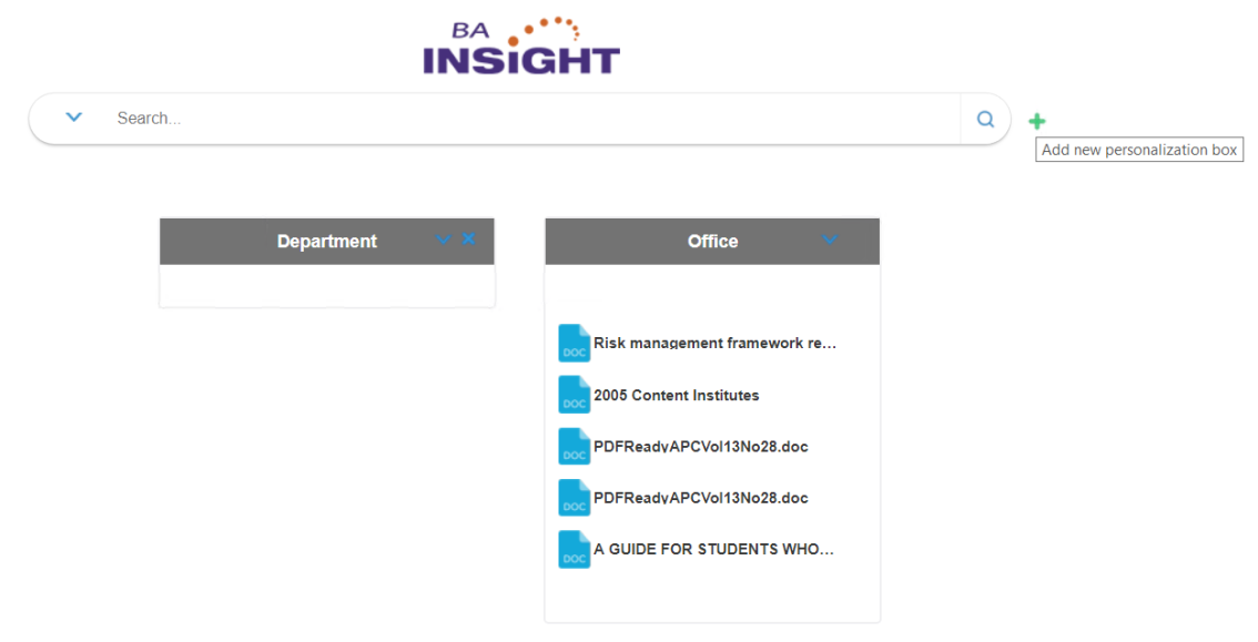 - On the landing page, the Personalization pop-up can be called by clicking the '+' (Add new personalization box) button, found next to the search field.