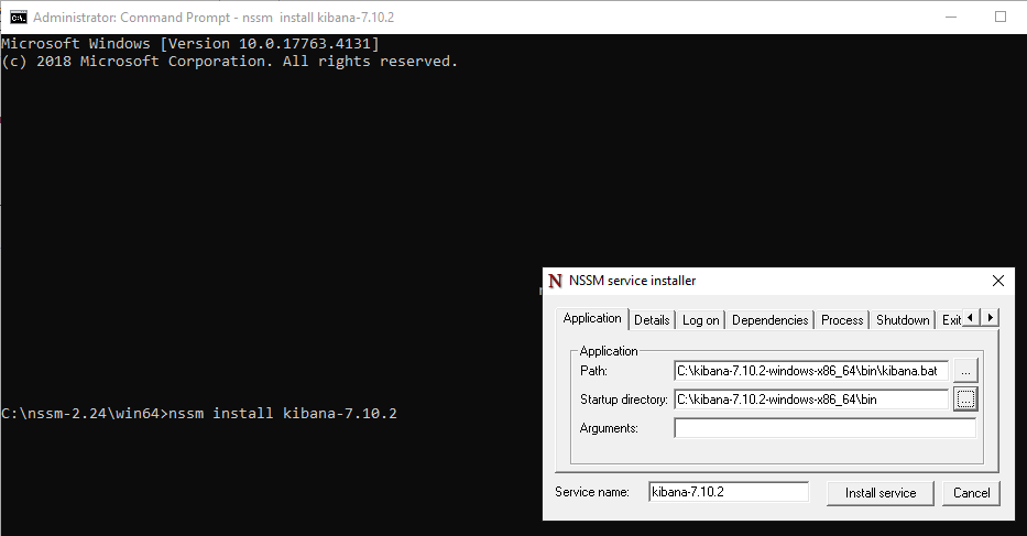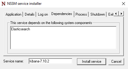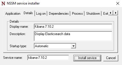 nssm install kibana-7.0.0In the "NSSM service installer" window: