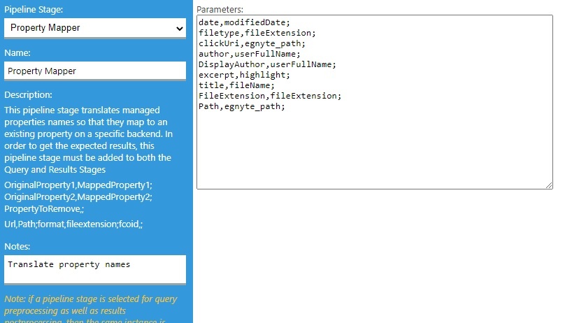 After the Backend is configured, ensure the Property Mapper pipeline stage is configured for both the Query and Results pipeline stages for your new Egnyte Backend.