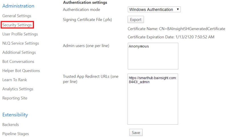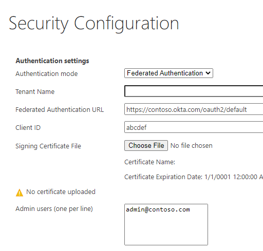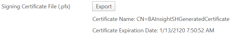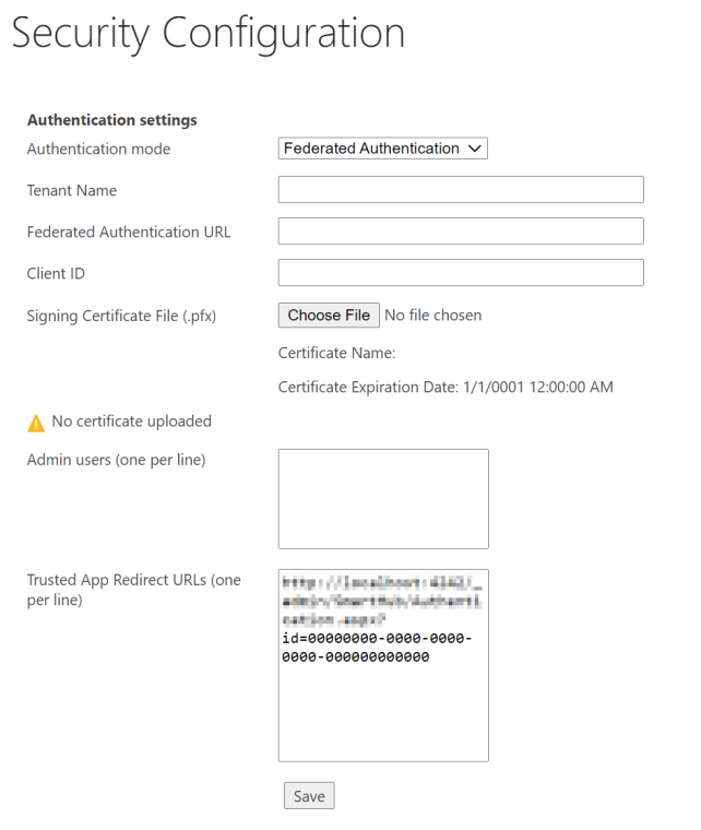 If a certificate is not found in the security configuration file, a new certificate will be automatically generated when clicking "Save". The newly generated certificate will be availale for 100 years.- Signing Certificate File (required): The Name and Expiration date of the generated certificate (if these 2 fields are blank it means no certificate exists yet)