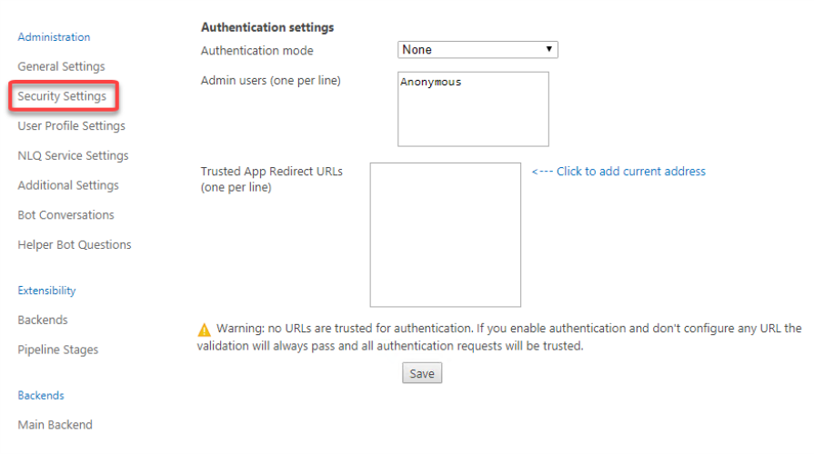 - Security Settings: Click "Security Settings" and the Authentication settings page appears.