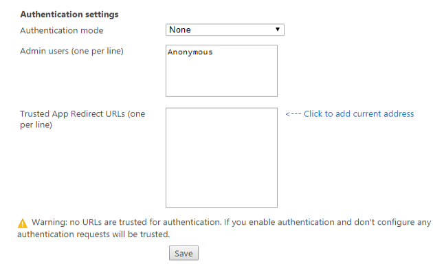 If you enable authentication but do not configure any URL, validation requests pass and all authentication requests are trusted.
