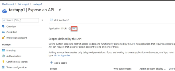 - To manually set your App ID URI, click Set at the top of the page.
