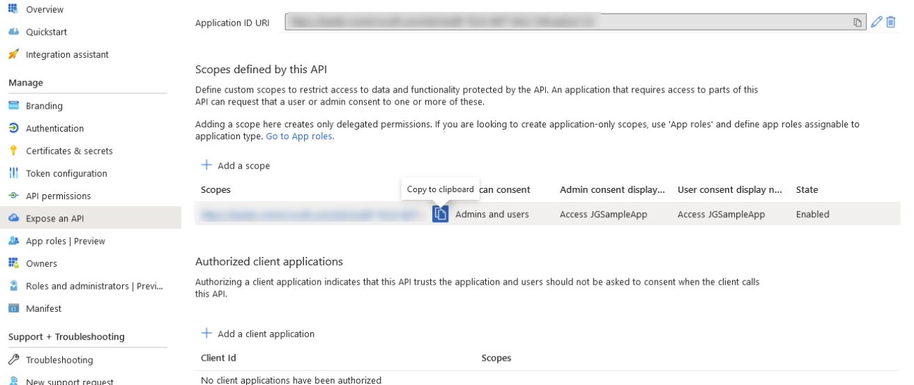 In the window that appears, note the Application ID URI is shown below the "Scope name" field (with the field empty).