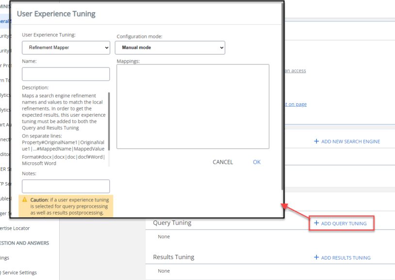 - The various Tuning stages are accessible from the drop-down menu in the tunings dialogue box that appears when adding a Query or Results Tuning stage.