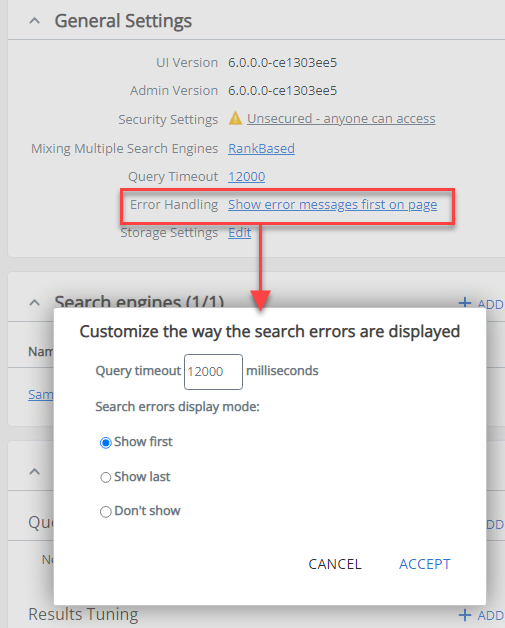 • Show first: Search errors appear at the top of the search results. Enabled by default.