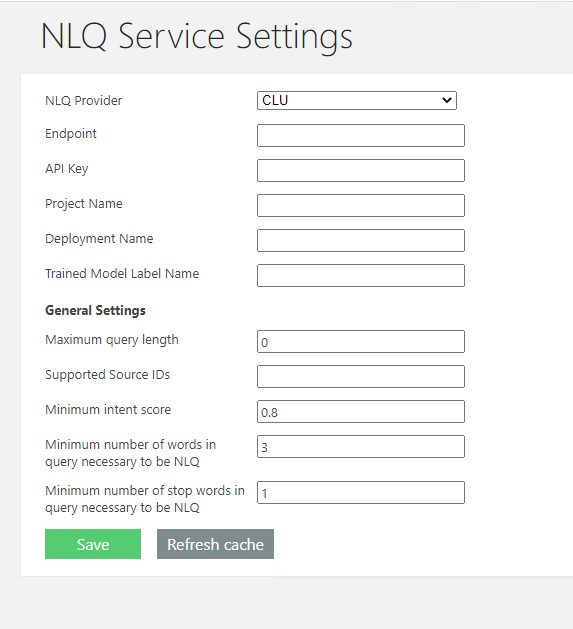 The NLQ Service Configuration page can be found by accessing the NLQ Service Settings page from the Administration page: