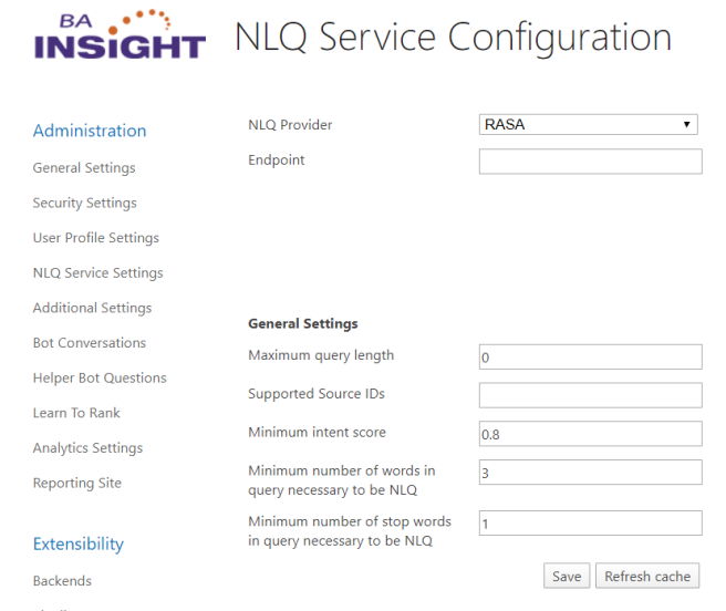 The NLQ Service Configuration page can be found by accessing theNLQ Service Settingspage from the Administrationpage: