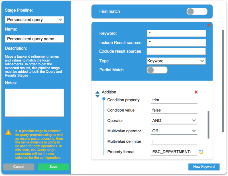 - The Personalized Query pipeline stage enables you to append information to an actively running user query.