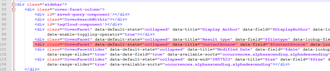 - Locate a refiner or "facet" such as "ContentSource" around line 100 in the graphic below and copy/paste it onto the next line.