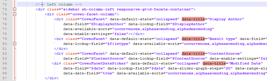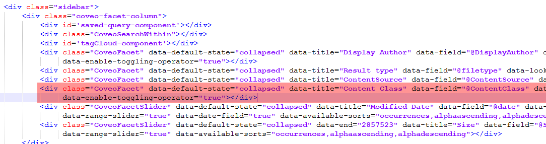 - CoveoFacet - The standard <div> class. Can be set as collapsed or expanded.