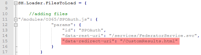 - Paste the code into line 11 of the file CustomIndexSettings.js. Modify line 15 to point to the file "CustomResults.html":