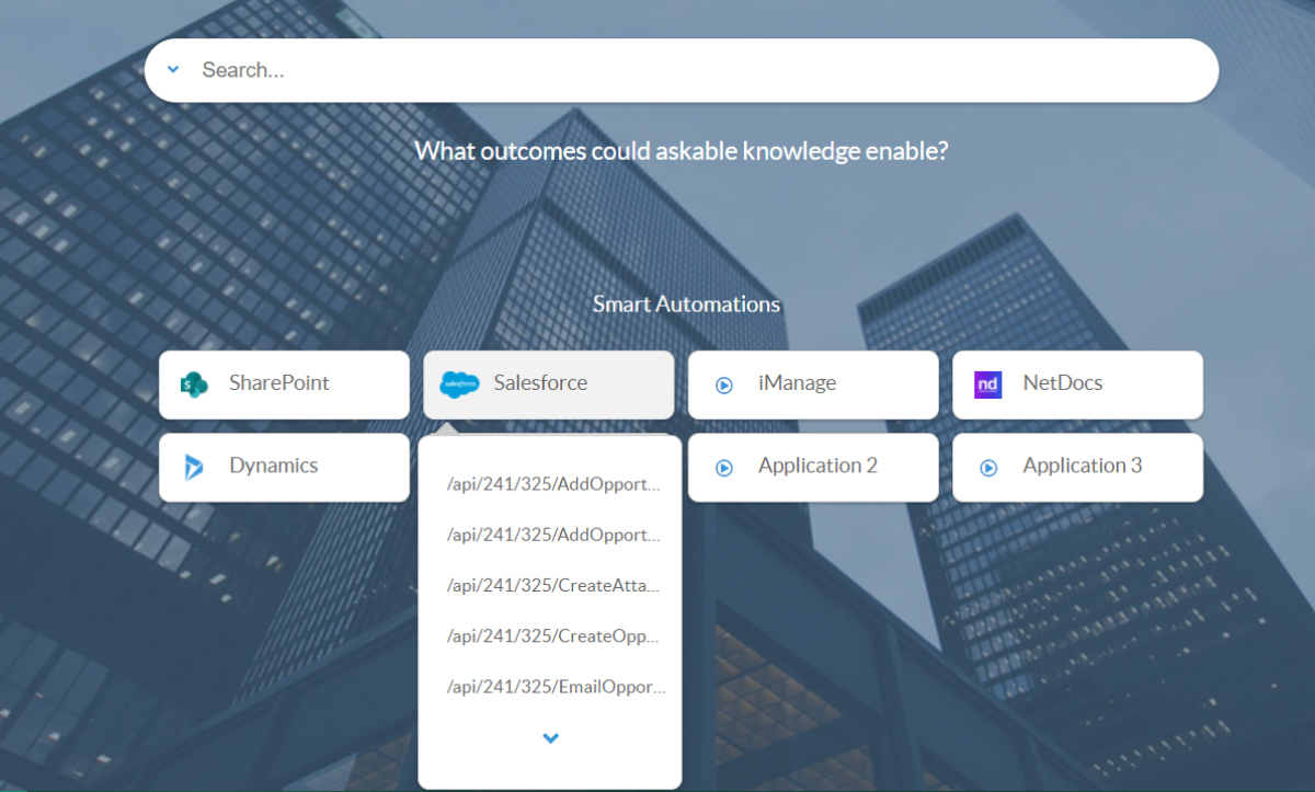 - Navigate through the list of automations that you have access to in AppBus and see what application they rely on behind the scenes, such as Salesforce, SharePoint, NetDocuments, etc.