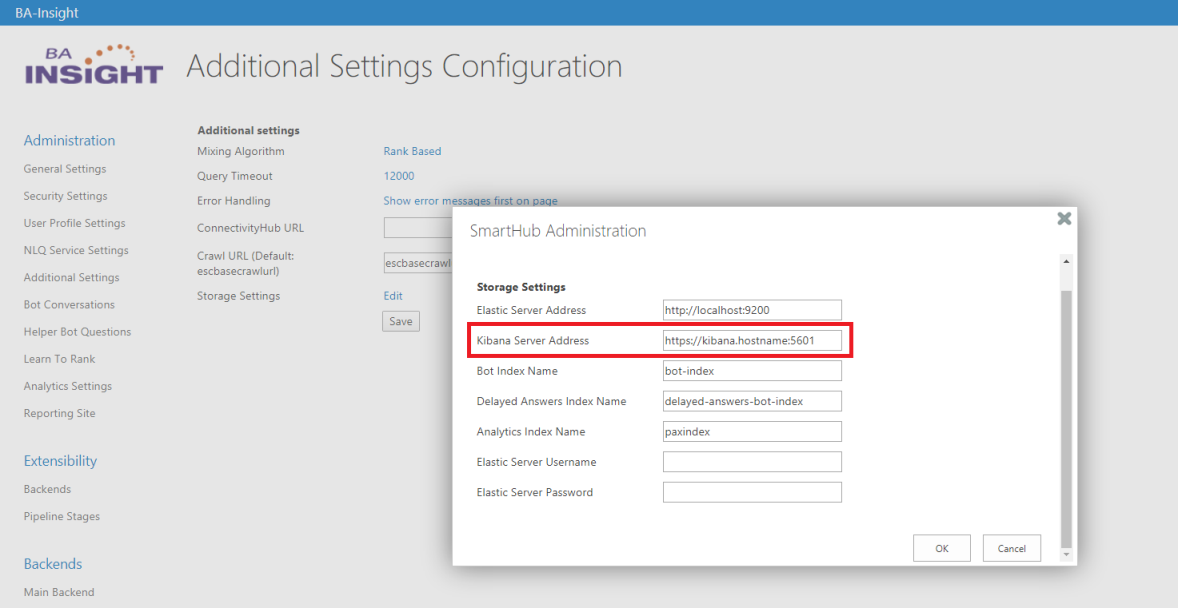 5. Go to the Additional Settings Configuration page and replace the Kibana Server Address with the new address shown in the screenshot below: