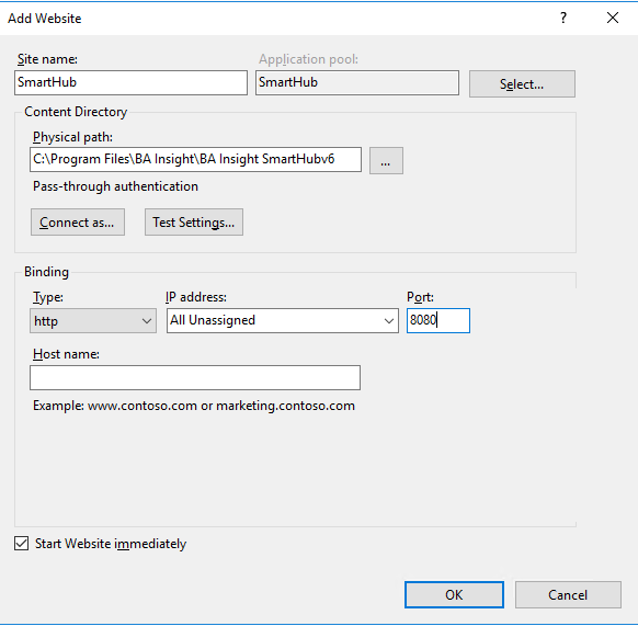 - Create the SmartHub Web Site in IIS