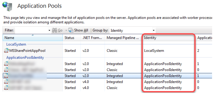 - Select the Application Pool you wish to change. Note that you can sort your Application Pools by categories such as Name, Status, Identity, Applications, and so on.
