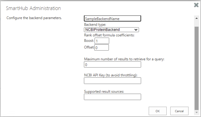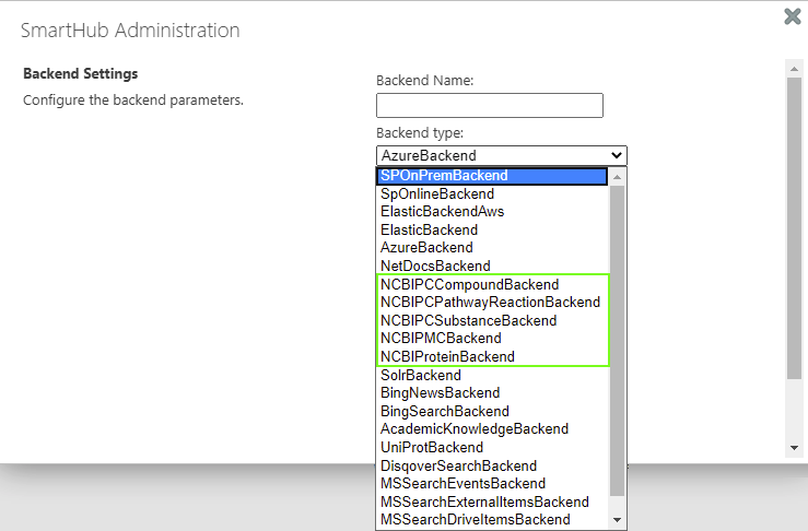 - The Backend Settings page appears. Select your PubMed/PubChem backend from the "Backend type" drop-down menu: