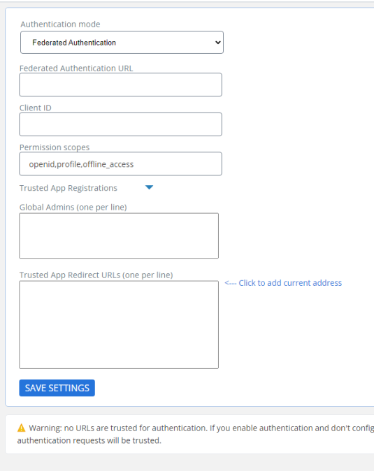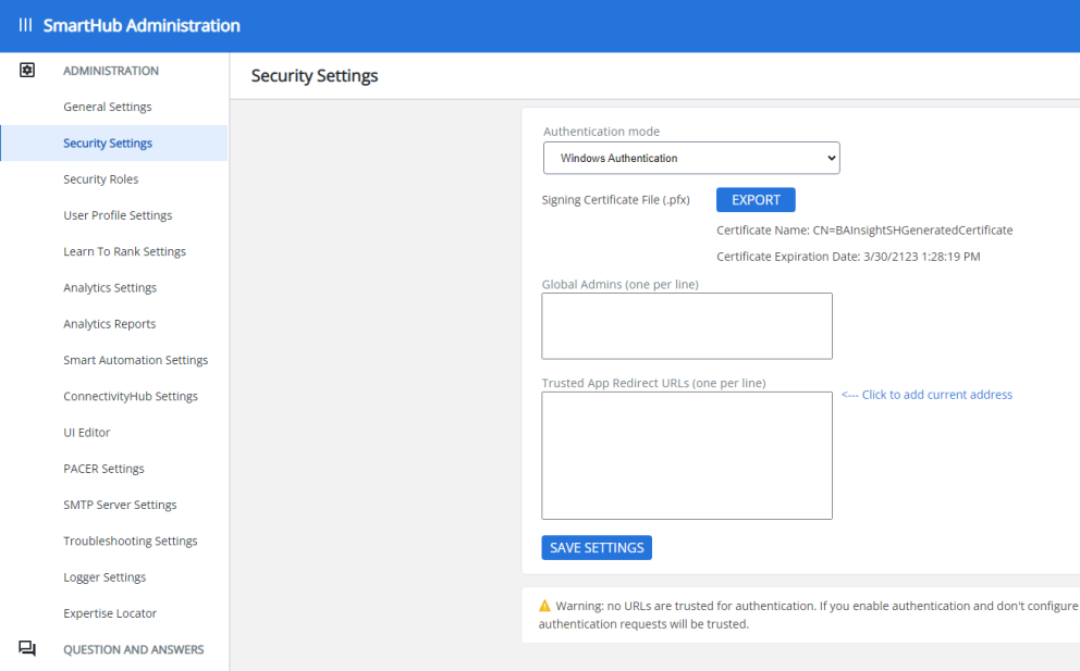 - Trusted App Redirect: Click the "<—Click to add current address" link on the page to enter your SmartHub site URL if it isn't currently there.