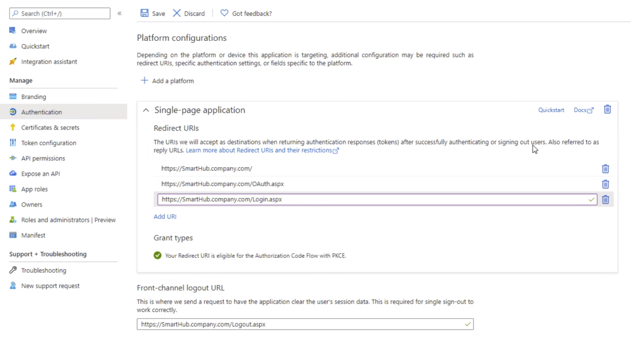 NOTE: If you have existing Redirect URIs, recreate them anew instead of migrating them to the single-page application (SPA) platform configuration. - Click Save at the top of the page.