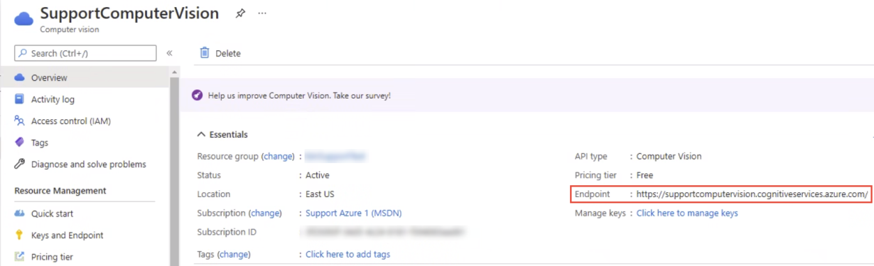 - Endpoint url: Enter the URL used to make calls to the Computer Vision API. The "computer vision" resource in the Azure Portal contains your endpoint URL. See the example below: