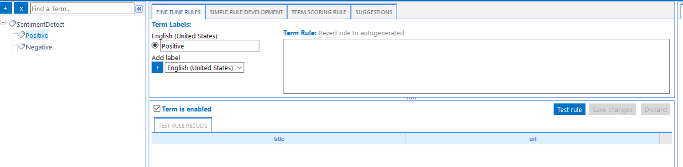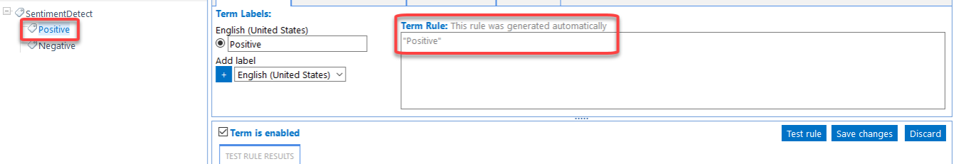 - In the following example, the Taxonomy "SentimentDetect" has two terms defined: