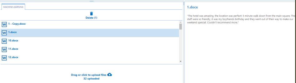Drag-and-drop or click the icon at the bottom of the MACHINE LEARNING tab to add the documents that contain training data. See the example below (the documents added contain "positive" and "negative" language).