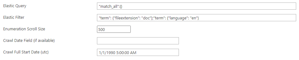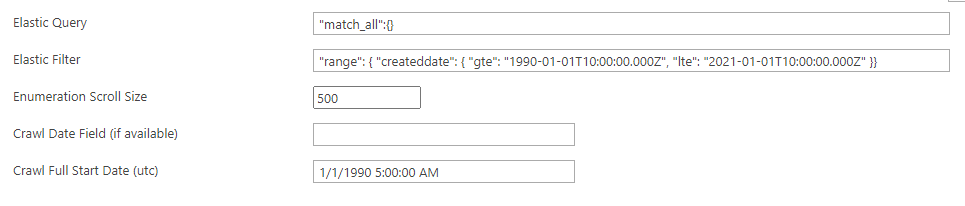 - In the Crawl Date Field (if available) field, enter the date-time field for your Elastic index. If the Elastic Index has a date-time field which represents the modification date/time of each item within the index, then incremental crawls are possible. Without a date-time field, you can run only Full Crawls.