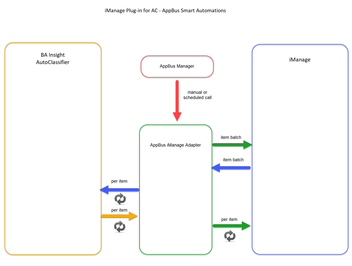 The iManage AppBus Plug-in for AutoClassifier integrates the AutoClassifier processing pipeline capabilities with the iManage source system.