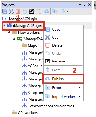 - From the left side, right-click on iManageACPlugin and select Publish from the sub-menu that appears.