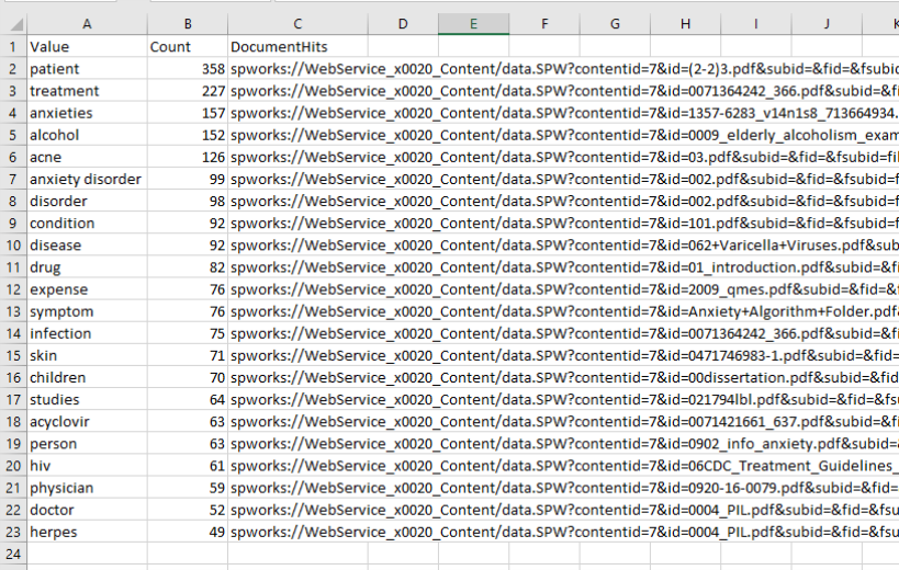 - Below, see a sample of captured information containing the most frequently met metadata values along with the documents they were found in.