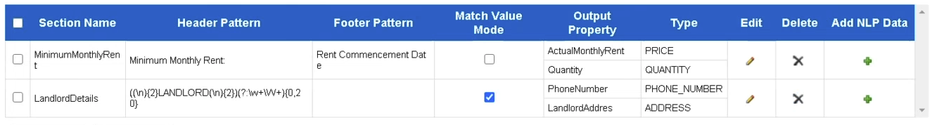 To extract even more detailed information from the document, add NLP data to the Section Patterns table.
