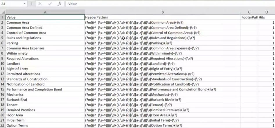 In the example below, the sample contract at the top of this page and the Regex pattern shown here is used to create the .csv file in "Sample Captured Data," (below).