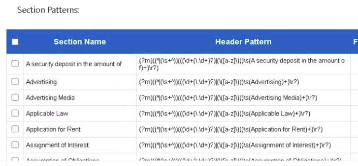 - Regex Patterns:This table defines the set of regex patterns used to capture section headers. The stage comes with a predefined regex expression that captures the most commonly used section headers in documents.