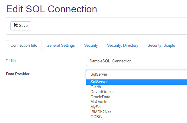 - The "Database Connection Page" heading below provides an example of a SQL connection.